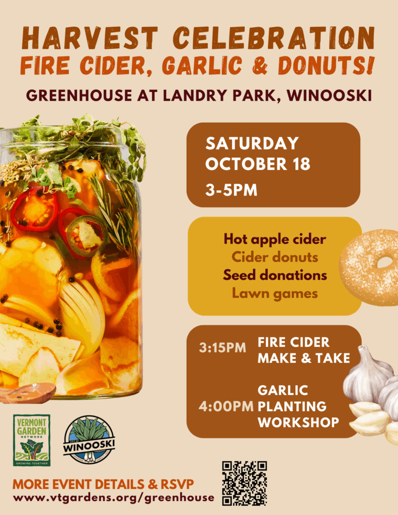- 3-5pm – Apple cider and donuts, seed packet donations, walk around the greenhouse to admire our winter greens production, chat with VGN staff to learn more about our organization.